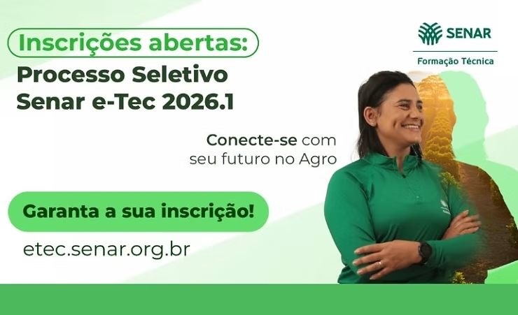 O Serviço Nacional de Aprendizagem Rural do Tocantins (Senar) está com inscrições abertas para os cursos técnicos em Zootecnia e Segurança do Trabalho, com vagas disponíveis nos polos de Ananás, Paraíso do Tocantins, Taguatinga e Gurupi. As vagas são para os cursos de Técnico em Zootecnia e Técnico em Segurança no Trabalho. As inscrições já estão abertas e podem ser feitas pelo site https://etec.senar.org.br/processo-seletivo.