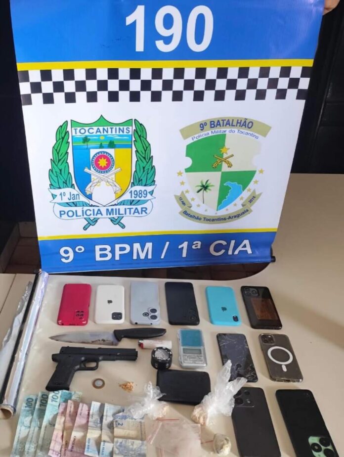 No interior do imóvel, a equipe do 9º Batalhão encontrou 11 pessoas reunidas em uma “resenha”, entre elas uma adolescente de 15 anos. Durante as buscas, foram apreendidos 38,4 gramas de crack, 15,3 gramas de maconha, 18 sachês com resquícios de cocaína, uma balança de precisão, uma réplica de pistola e R$ 622 em dinheiro.