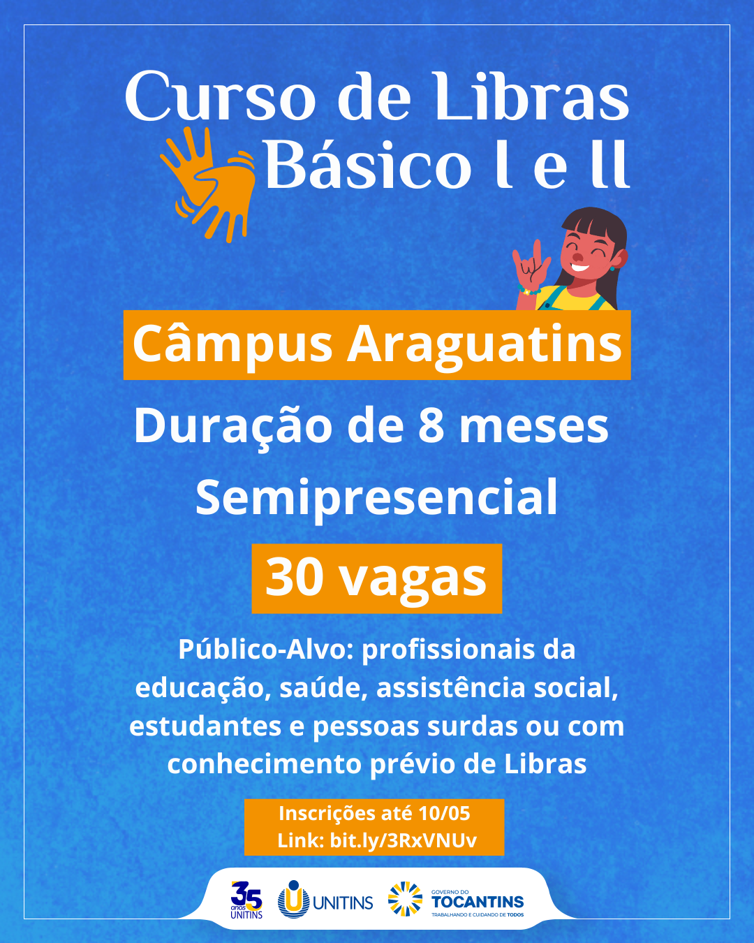 Estão abertas, até o dia 10 de maio, as inscrições para o curso de extensão gratuito de Libras Básico I e II, o processo deve ser feito de forma on-line, por meio do link e tem duração de 8 meses. O curso tem como objetivo capacitar profissionais para atuarem como intérpretes da Língua Brasileira de Sinais (Libras) em diversos contextos, promovendo a inclusão e a acessibilidade. As aulas serão ministradas de forma semipresencial, no Câmpus Araguatins da Universidade Estadual do Tocantins (Unitins).