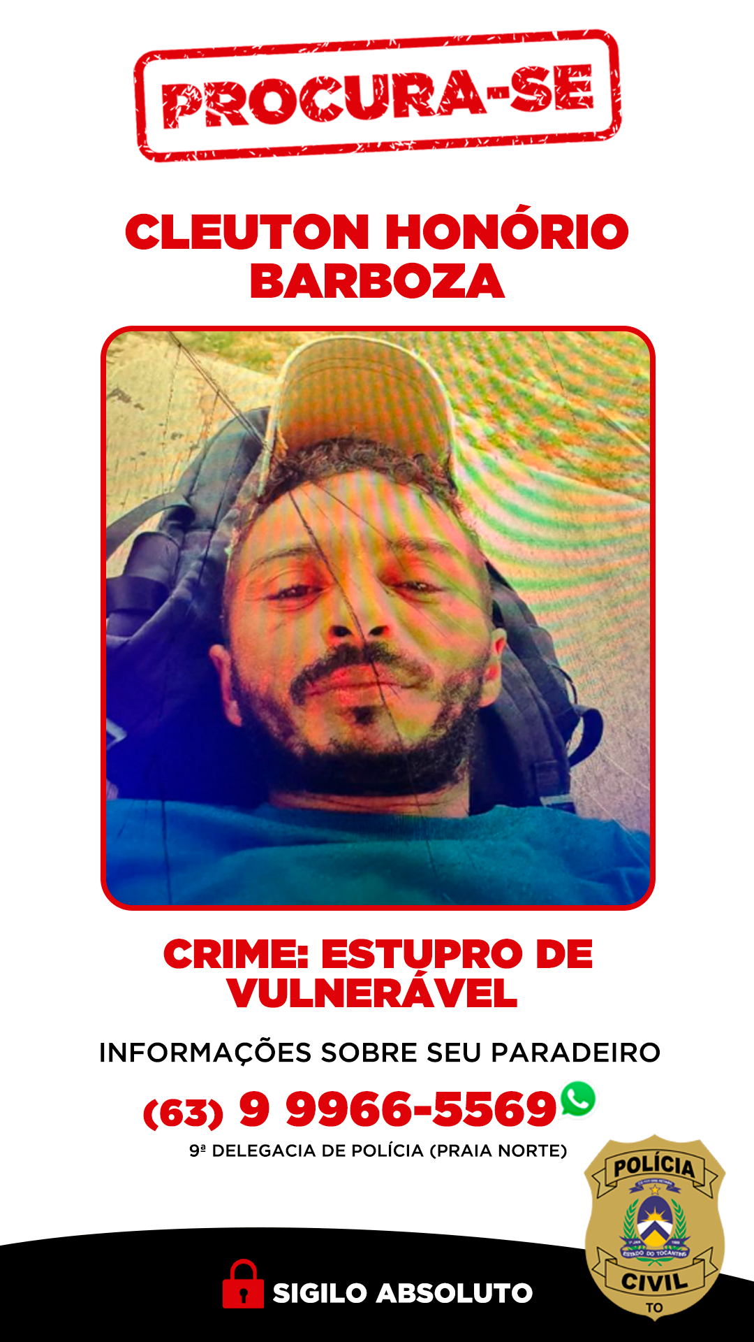 A Polícia Civil reforça o pedido para que qualquer informação que possa auxiliar na localização de Cleuton Honório Barboza seja repassada à 9ª Delegacia de Polícia Civil de Praia Norte, pelo telefone/WhatsApp da 2ª Delegacia Especializada de Atendimento à Mulher e Vulneráveis (DEAMV – Augustinópolis): (63) 9 9966-5569, ou presencialmente em qualquer unidade da Polícia Civil do Tocantins.