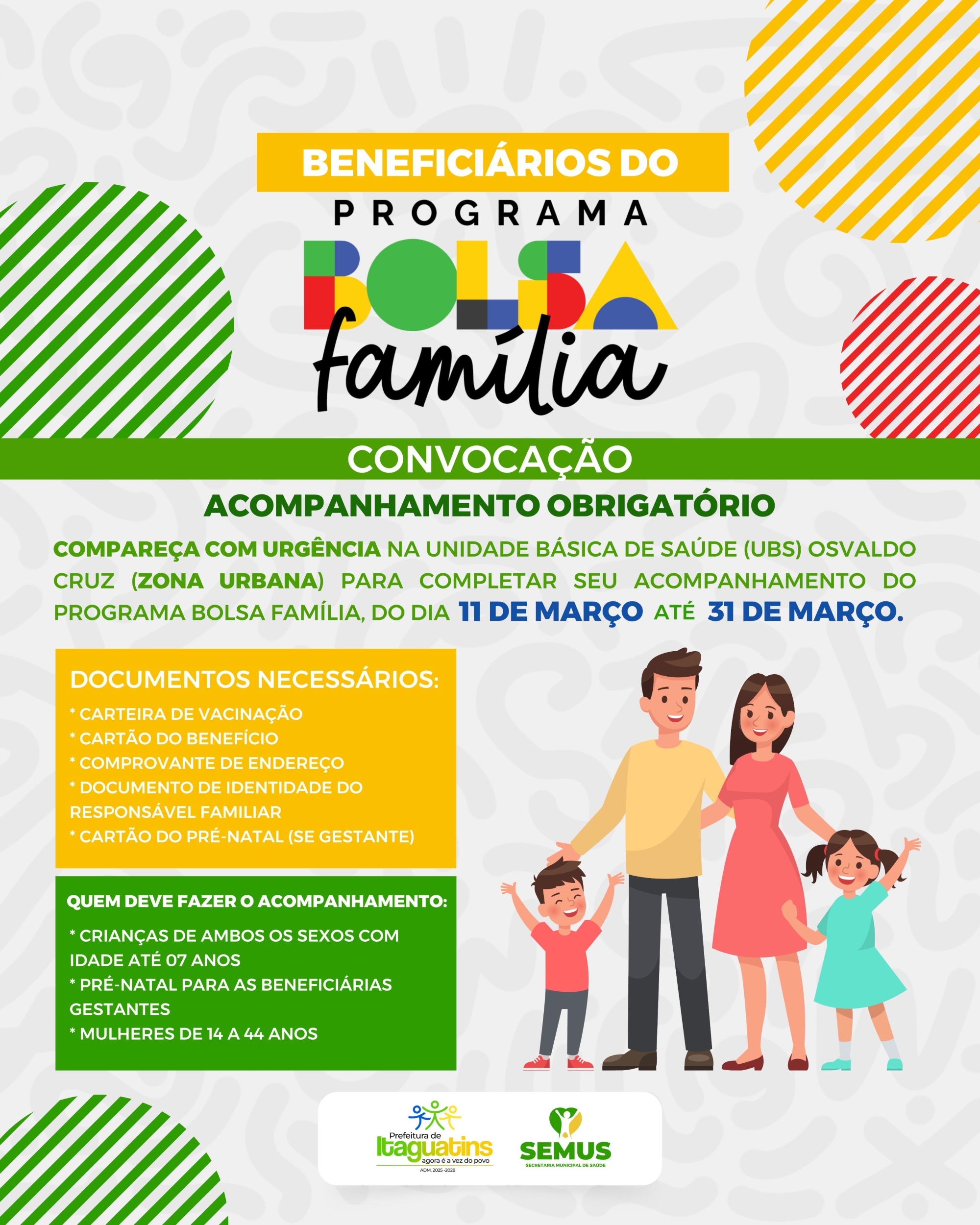 A Secretaria Municipal de Saúde de Itaguatins (Semus), convoca beneficiários para acompanhado obrigatório do Programa Bolsa Família. A secretária de Saúde, Karlen Guerra, explica que os beneficiários deverão comparecer com urgência na Unidade Básica de Saúde (UBS) Osvaldo Cruz, para completar o acompanhamento do Programa Bolsa Família. O prazo da convocação vai até 31 de março deste ano.