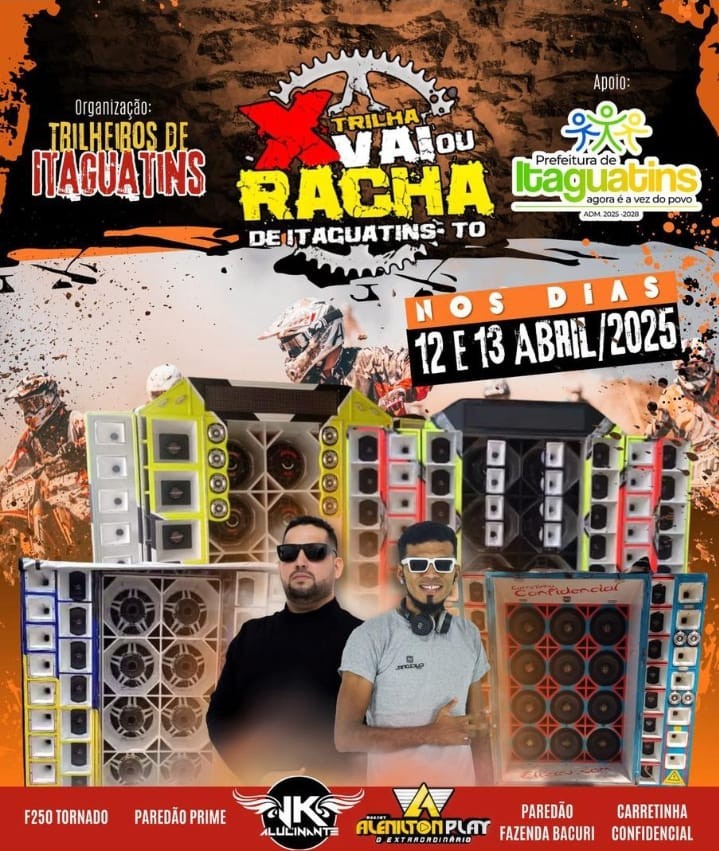 A trilha “Vai ou Racha”, organizada pelo grupo Trilheiros de Itaguatins, contará com atrações de peso, como F-350 Tornado, Paredão Prime, MC Potassa, JK Alucinante, Alenilton Play, Paredão Fazenda Bacuri e Carretinha Confidencial, prometendo uma verdadeira explosão de som e emoção.