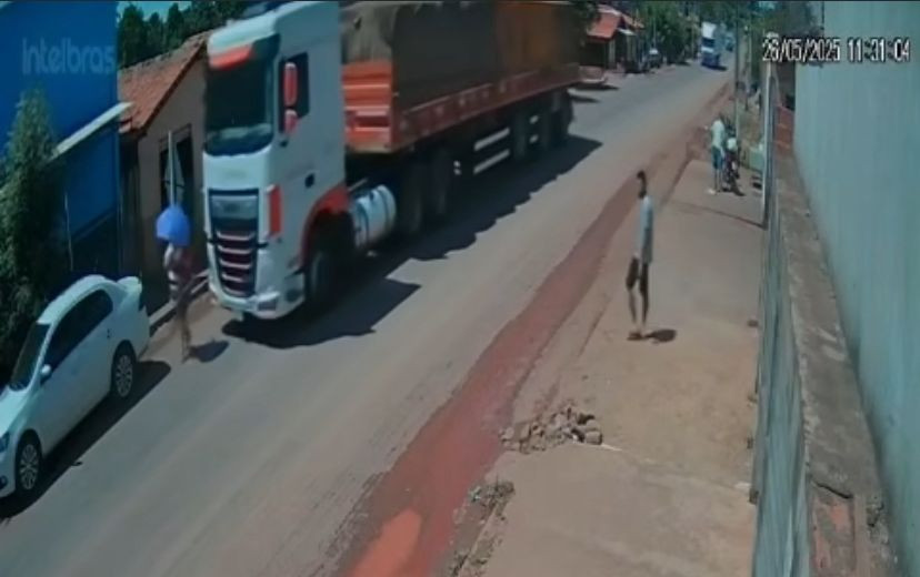 Imagens de câmeras de segurança na rua registraram o acidente (veja o vídeo ao final da matéria). A mulher andava com um guarda-sol pela via pública e carregando a criança no colo. Ela estava de costas e não percebe quando a carreta se aproxima e é atropelada.