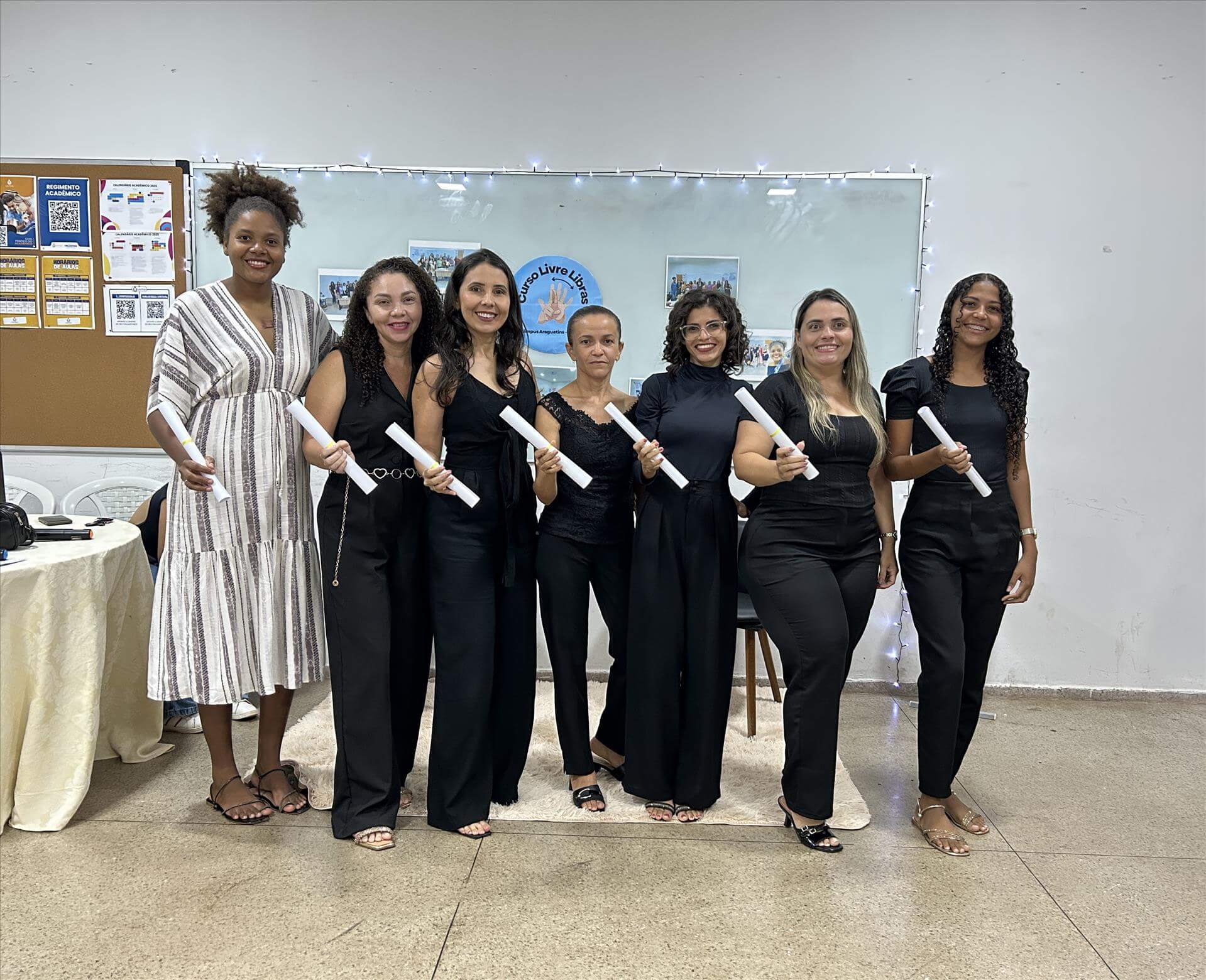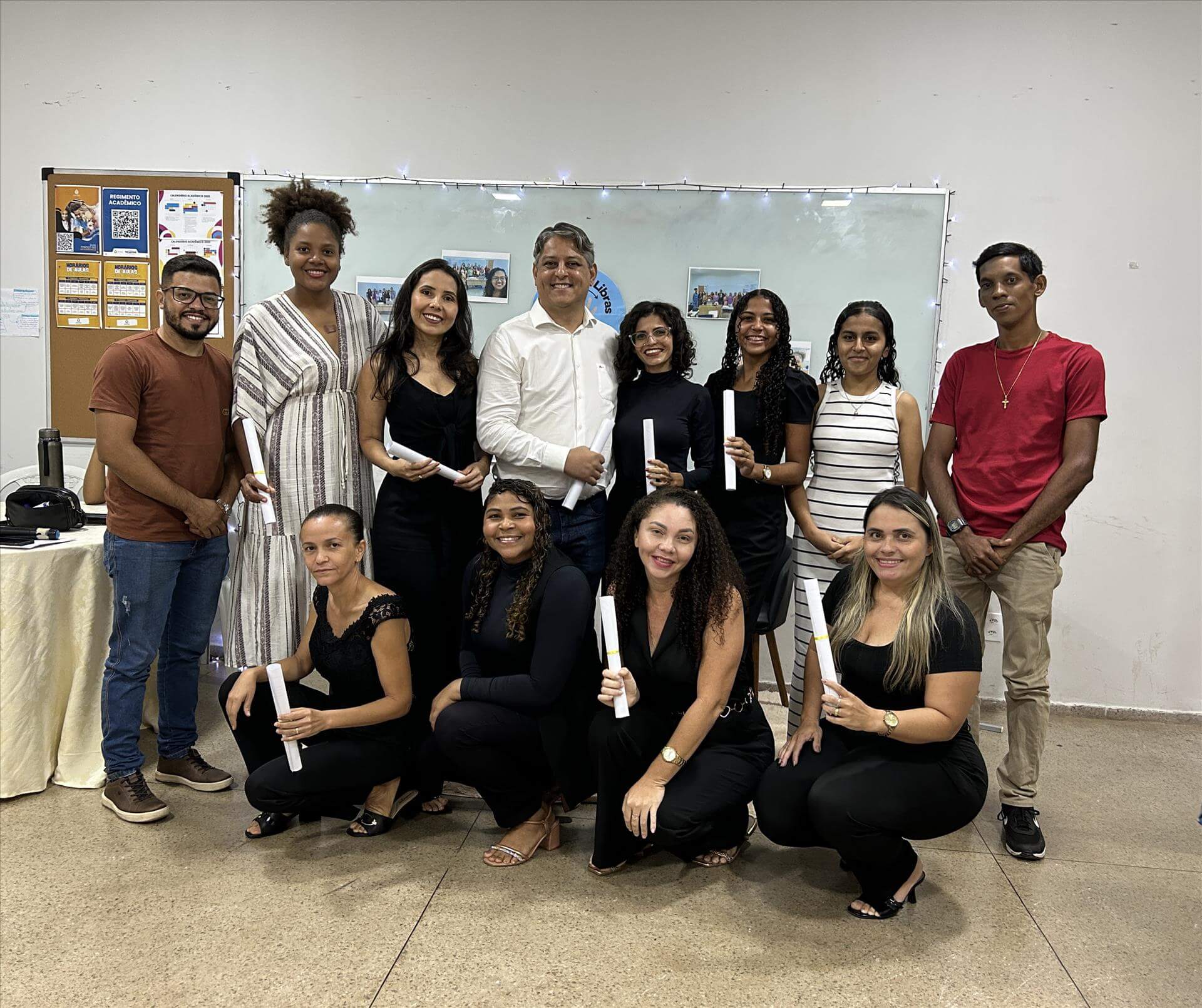 O encerramento do curso de extensão gratuito de Libras Básico I e II foi marcado por uma confraternização que ocorreu nesta terça-feira, 16, no Câmpus Araguatins da Universidade Estadual do Tocantins (Unitins) com a participação ativa dos alunos e professores que participaram da formação. O curso teve duração de 8 meses com o objetivo de capacitar profissionais para atuarem como intérpretes de Libras, na ocasião, 14 certificados foram entregues aos participantes.
