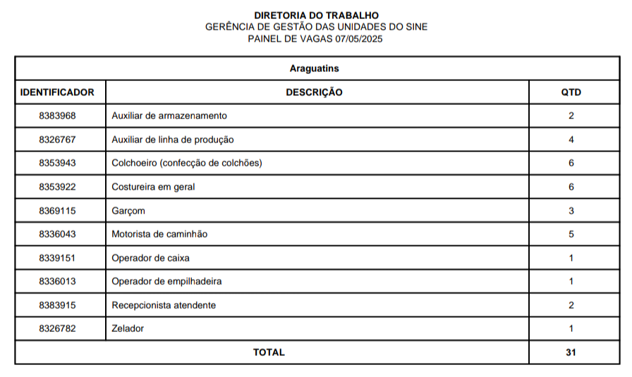 O Sistema Nacional de Emprego (Sine) disponibiliza vagas de emprego em Araguatins, Araguaína, Dianópolis, Guaraí, Gurupi, Palmas, Paraíso, Porto Nacional e Taquaralto, nesta quarta-feira, 07 de maio. São vagas para o Quadro Geral e para Pessoa com Deficiência, distribuídas nas 9 unidades do Sine estadual.