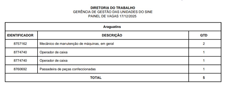 O Sistema Nacional de Emprego (Sine) disponibiliza vagas de emprego em Araguatins, Araguaína, Colinas, Dianópolis, Guaraí, Gurupi, Luzimangues, Palmas, Paraíso, Porto Nacional e Taquaralto, nesta quarta-feira, 17 de dezembro de 2025. São vagas para o Quadro Geral e para Pessoa com Deficiência, distribuídas nas 11 unidades do Sine estadual.
