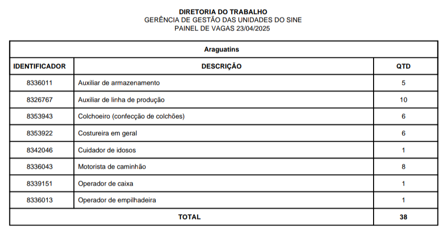 O Sistema Nacional de Emprego (Sine) disponibiliza vagas de emprego em Araguatins, Araguaína, Dianópolis, Guaraí, Gurupi, Palmas, Paraíso, Porto Nacional e Taquaralto, nesta quarta-feira, 23 de abril. São vagas para o Quadro Geral e para Pessoa com Deficiência, distribuídas nas 9 unidades do Sine estadual.