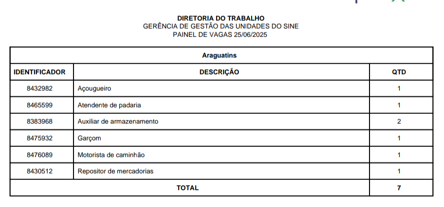 O Sistema Nacional de Emprego (Sine) disponibiliza vagas de emprego em Araguatins, Araguaína, Dianópolis, Guaraí, Gurupi, Palmas, Paraíso, Porto Nacional e Taquaralto, nesta quarta-feira, 25 de junho. São vagas para o Quadro Geral e para Pessoa com Deficiência, distribuídas nas 9 unidades do Sine estadual.