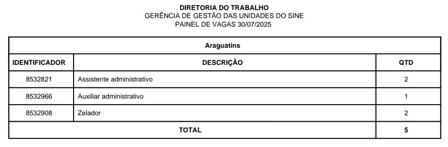 O Sistema Nacional de Emprego (Sine) disponibiliza vagas de emprego em Araguatins, Araguaína, Dianópolis, Guaraí, Gurupi, Palmas, Paraíso, Porto Nacional e Taquaralto, nesta quarta-feira, 30 de julho. São vagas para o Quadro Geral e para Pessoa com Deficiência, distribuídas nas 9 unidades do Sine estadual.