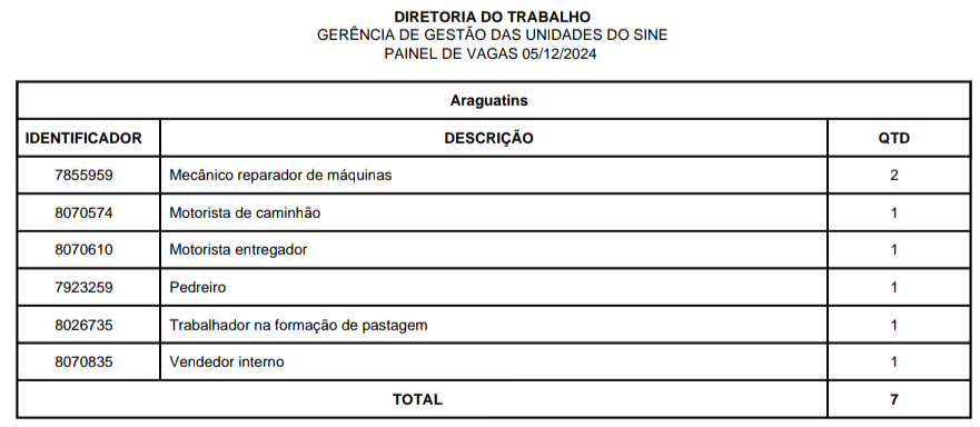 O Sistema Nacional de Emprego (Sine) disponibiliza vagas de emprego em Araguatins, Araguaína, Dianópolis, Guaraí, Gurupi, Palmas, Paraíso, Porto Nacional e Taquaralto, nesta quinta-feira, 05 de dezembro. São vagas para o Quadro Geral e para Pessoa com Deficiência, distribuídas nas 9 unidades do Sine estadual.