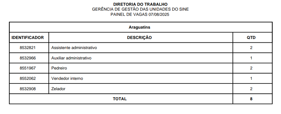 O Sistema Nacional de Emprego (Sine) disponibiliza vagas de emprego em Araguatins, Araguaína, Dianópolis, Guaraí, Gurupi, Palmas, Paraíso, Porto Nacional e Taquaralto, nesta quinta-feira, 07 de agosto. São vagas para o Quadro Geral e para Pessoa com Deficiência, distribuídas nas 9 unidades do Sine estadual.
