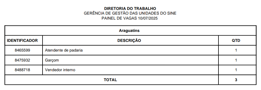 O Sistema Nacional de Emprego (Sine) disponibiliza vagas de emprego em Araguatins, Araguaína, Dianópolis, Guaraí, Gurupi, Palmas, Paraíso, Porto Nacional e Taquaralto, nesta quinta-feira, 10 de julho. São vagas para o Quadro Geral e para Pessoa com Deficiência, distribuídas nas 9 unidades do Sine estadual.