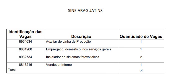 O Sistema Nacional de Emprego (Sine) disponibiliza vagas de emprego em Araguatins, Araguaína, Colinas, Dianópolis, Guaraí, Gurupi, Luzimangues, Palmas, Paraíso, Porto Nacional e Taquaralto, nesta quinta-feira, 23 de abril de 2026. São vagas para o Quadro Geral e para Pessoa com Deficiência, distribuídas nas 11 unidades do Sine estadual.