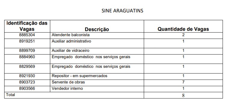 O Sistema Nacional de Emprego (Sine) disponibiliza vagas de emprego em Araguatins, Araguaína, Colinas, Dianópolis, Guaraí, Gurupi, Luzimangues, Palmas, Paraíso, Porto Nacional e Taquaralto, nesta quinta-feira, 26 de março de 2026. São vagas para o Quadro Geral e para Pessoa com Deficiência, distribuídas nas 11 unidades do Sine estadual.