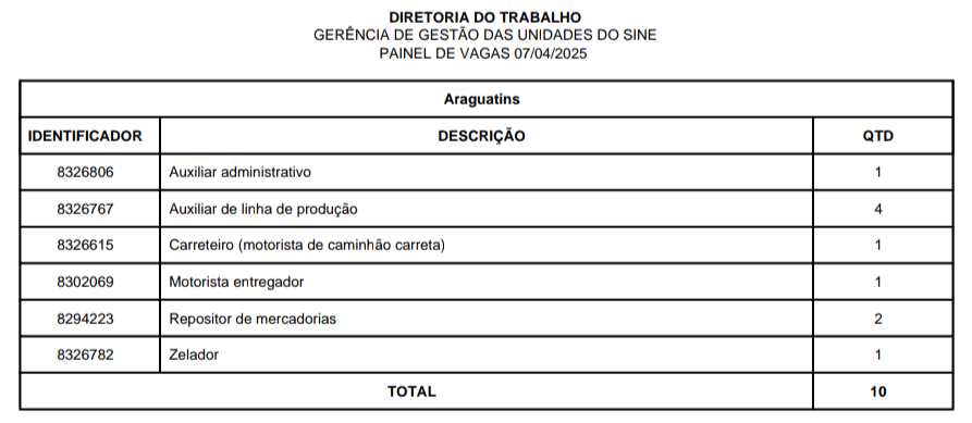 O Sistema Nacional de Emprego (Sine) disponibiliza vagas de emprego em Araguatins, Araguaína, Dianópolis, Guaraí, Gurupi, Palmas, Paraíso, Porto Nacional e Taquaralto, nesta segunda-feira, 07 de abril. São vagas para o Quadro Geral e para Pessoa com Deficiência, distribuídas nas 9 unidades do Sine estadual.