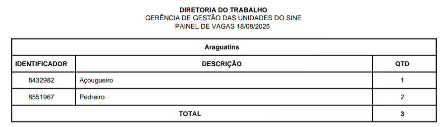 O Sistema Nacional de Emprego (Sine) disponibiliza vagas de emprego em Araguatins, Araguaína, Dianópolis, Guaraí, Gurupi, Palmas, Paraíso, Porto Nacional e Taquaralto, nesta segunda-feira, 18 de agosto. São vagas para o Quadro Geral e para Pessoa com Deficiência, distribuídas nas 9 unidades do Sine estadual.