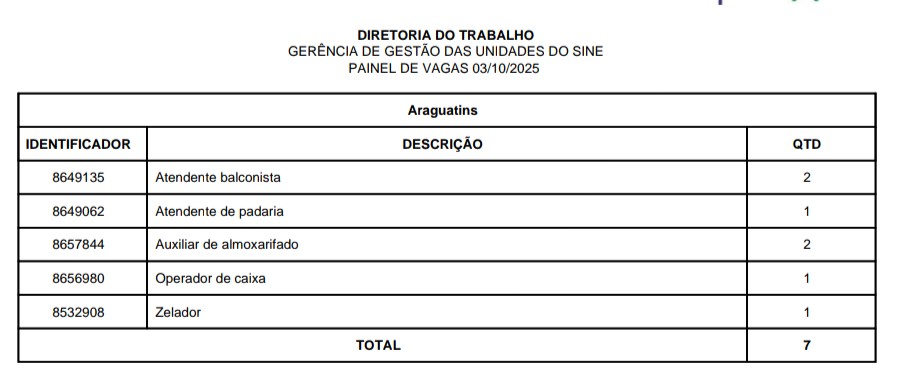 O Sistema Nacional de Emprego (Sine) disponibiliza vagas de emprego em Araguatins, Araguaína, Dianópolis, Guaraí, Gurupi, Palmas, Paraíso, Porto Nacional e Taquaralto, nesta sexta-feira, 03 de outubro de 2025. São vagas para o Quadro Geral, distribuídas nas 9 unidades do Sine estadual.