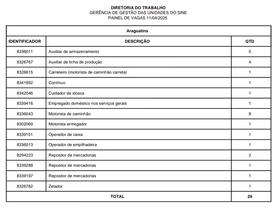 O Sistema Nacional de Emprego (Sine) disponibiliza vagas de emprego em Araguatins, Araguaína, Dianópolis, Guaraí, Gurupi, Palmas, Paraíso, Porto Nacional e Taquaralto, nesta sexta-feira, 11 de abril. São vagas para o Quadro Geral e para Pessoa com Deficiência, distribuídas nas 9 unidades do Sine estadual.