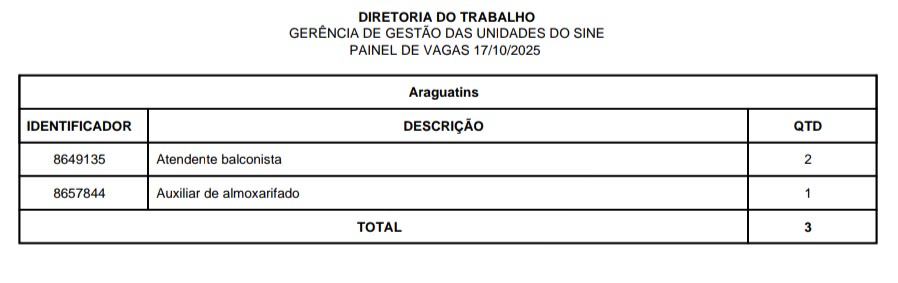 O Sistema Nacional de Emprego (Sine) disponibiliza vagas de emprego em Araguatins, Araguaína, Dianópolis, Guaraí, Gurupi, Palmas, Paraíso, Porto Nacional e Taquaralto, nesta sexta-feira, 17 de outubro de 2025. São vagas para o Quadro Geral e para Pessoa com Deficiência, distribuídas nas 9 unidades do Sine estadual.