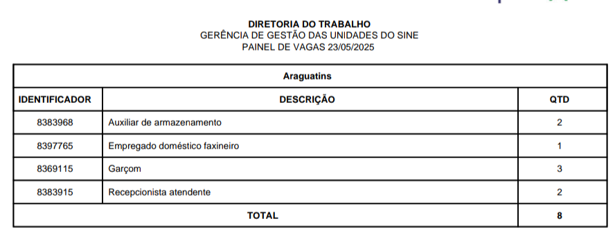 O Sistema Nacional de Emprego (Sine) disponibiliza vagas de emprego em Araguatins, Araguaína, Dianópolis, Guaraí, Gurupi, Palmas, Paraíso, Porto Nacional e Taquaralto, nesta sexta-feira, 23 de maio. São vagas para o Quadro Geral e para Pessoa com Deficiência, distribuídas nas 9 unidades do Sine estadual.