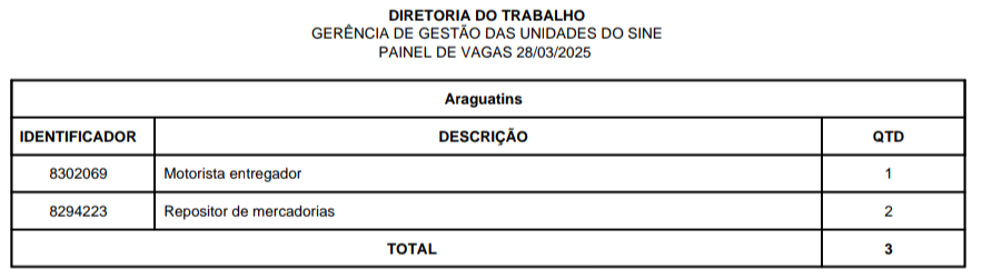 O Sistema Nacional de Emprego (Sine) disponibiliza vagas de emprego em Araguatins, Araguaína, Dianópolis, Guaraí, Gurupi, Palmas, Paraíso, Porto Nacional e Taquaralto, nesta sexta-feira, 28 de março. São vagas para o Quadro Geral e para Pessoa com Deficiência, distribuídas nas 9 unidades do Sine estadual.