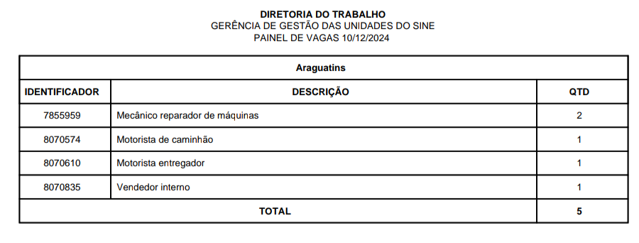 O Sistema Nacional de Emprego (Sine) disponibiliza vagas de emprego em Araguatins, Araguaína, Dianópolis, Guaraí, Gurupi, Palmas, Paraíso, Porto Nacional e Taquaralto, nesta terça-feira, 10 de dezembro. São vagas para o Quadro Geral e para Pessoa com Deficiência, distribuídas nas 9 unidades do Sine estadual.