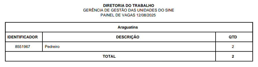 O Sistema Nacional de Emprego (Sine) disponibiliza vagas de emprego em Araguatins, Araguaína, Dianópolis, Guaraí, Gurupi, Palmas, Paraíso, Porto Nacional e Taquaralto, nesta terça-feira, 12 de agosto. São vagas para o Quadro Geral e para Pessoa com Deficiência, distribuídas nas 9 unidades do Sine estadual.