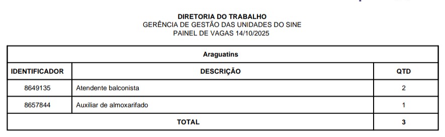 O Sistema Nacional de Emprego (Sine) disponibiliza vagas de emprego em Araguatins, Araguaína, Dianópolis, Guaraí, Gurupi, Palmas, Paraíso, Porto Nacional e Taquaralto, nesta terça-feira, 14 de outubro de 2025. São vagas para o Quadro Geral e para Pessoa com Deficiência, distribuídas nas 9 unidades do Sine estadual.