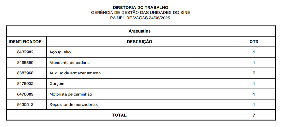 O Sistema Nacional de Emprego (Sine) disponibiliza vagas de emprego em Araguatins, Araguaína, Dianópolis, Guaraí, Gurupi, Palmas, Paraíso, Porto Nacional e Taquaralto, nesta terça-feira, 24 de junho. São vagas para o Quadro Geral e para Pessoa com Deficiência, distribuídas nas 9 unidades do Sine estadual.