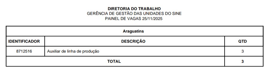 O Sistema Nacional de Emprego (Sine) disponibiliza vagas de emprego em Araguatins, Araguaína, Colinas, Dianópolis, Guaraí, Gurupi, Luzimangues, Palmas, Paraíso, Porto Nacional e Taquaralto, nesta terça-feira, 25 de novembro de 2025. São vagas para o Quadro Geral e para Pessoa com Deficiência, distribuídas nas 11 unidades do Sine estadual.