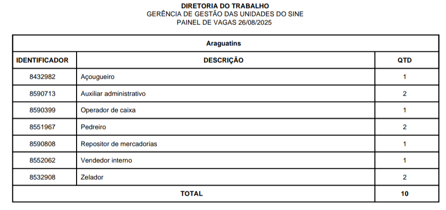 O Sistema Nacional de Emprego (Sine) disponibiliza vagas de emprego em Araguatins, Araguaína, Dianópolis, Guaraí, Gurupi, Palmas, Paraíso, Porto Nacional e Taquaralto, nesta terça-feira, 26 de agosto de 2025. São vagas para o Quadro Geral e para Pessoa com Deficiência, distribuídas nas 9 unidades do Sine estadual.