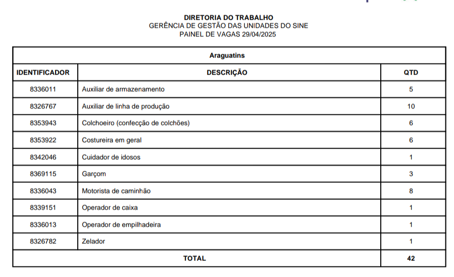 O Sistema Nacional de Emprego (Sine) disponibiliza vagas de emprego em Araguatins, Araguaína, Dianópolis, Guaraí, Gurupi, Palmas, Paraíso, Porto Nacional e Taquaralto, nesta terça-feira, 29 de abril. São vagas para o Quadro Geral e para Pessoa com Deficiência, distribuídas nas 9 unidades do Sine estadual.