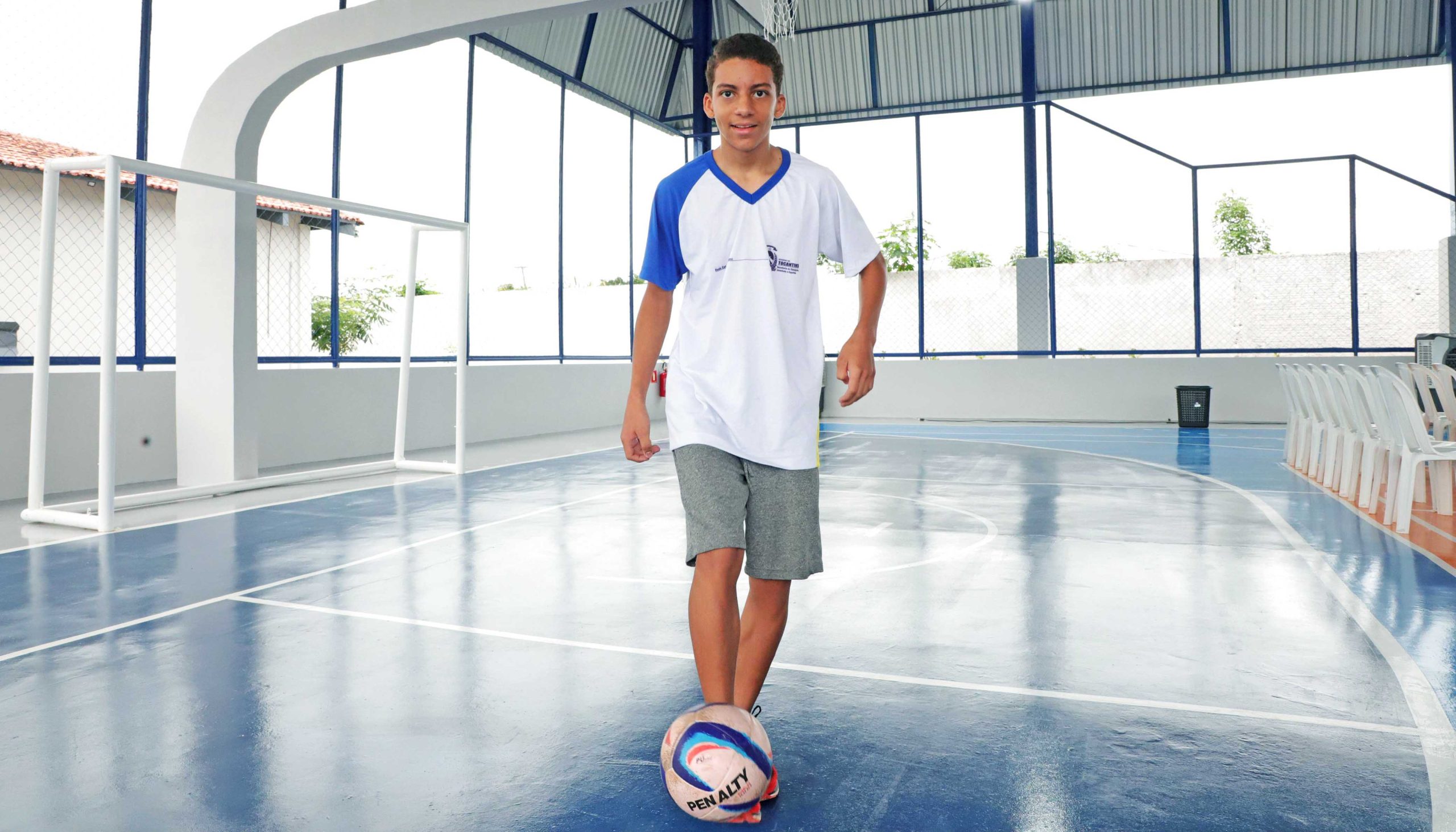 Estudante Artur Avelino Costa comemora a entrega da quadra que facilitará o acesso dos alunos às atividades esportivas sem necessidade de deslocamento