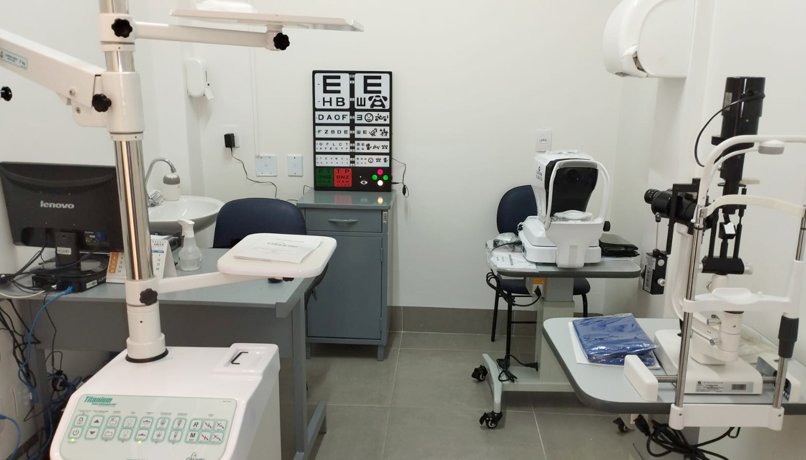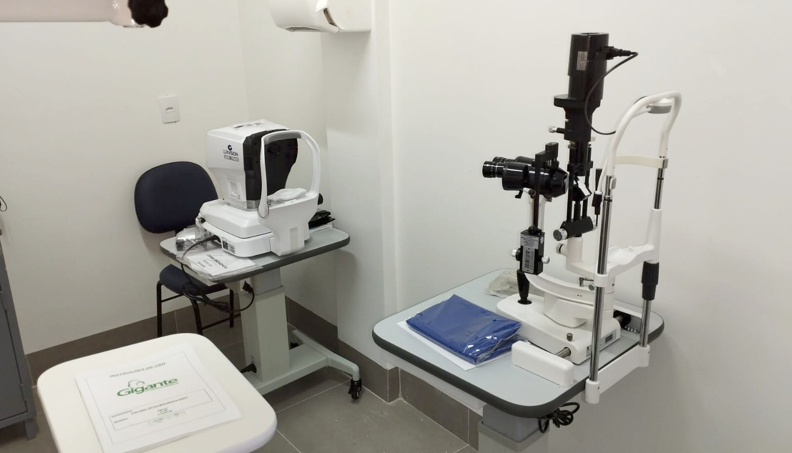 O consultório compreende lâmpada de fenda luxvision com mesa; autorefrator Luxvision LRK 7000 com mesa; tabela optotipos; coluna oftalmológica GRN; refrator de greens; tonômetro de aplanacão e cadeira oftalmológica expression CE 9000X.
