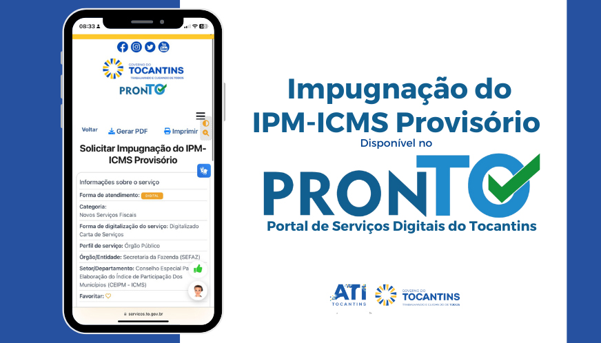 O Governo do Tocantins, por meio da Agência de Tecnologia da Informação (ATI) e em parceria com a Secretaria da Fazenda (Sefaz), lançou um novo serviço digital que permite a contestação on-line dos índices provisórios do Imposto sobre Circulação de Mercadorias e Serviços (ICMS) pelos municípios. A ferramenta elimina a necessidade de trâmites presenciais e papelada, tornando o processo mais ágil, transparente e acessível para as prefeituras e a Associação Tocantinense de Municípios (ATM).