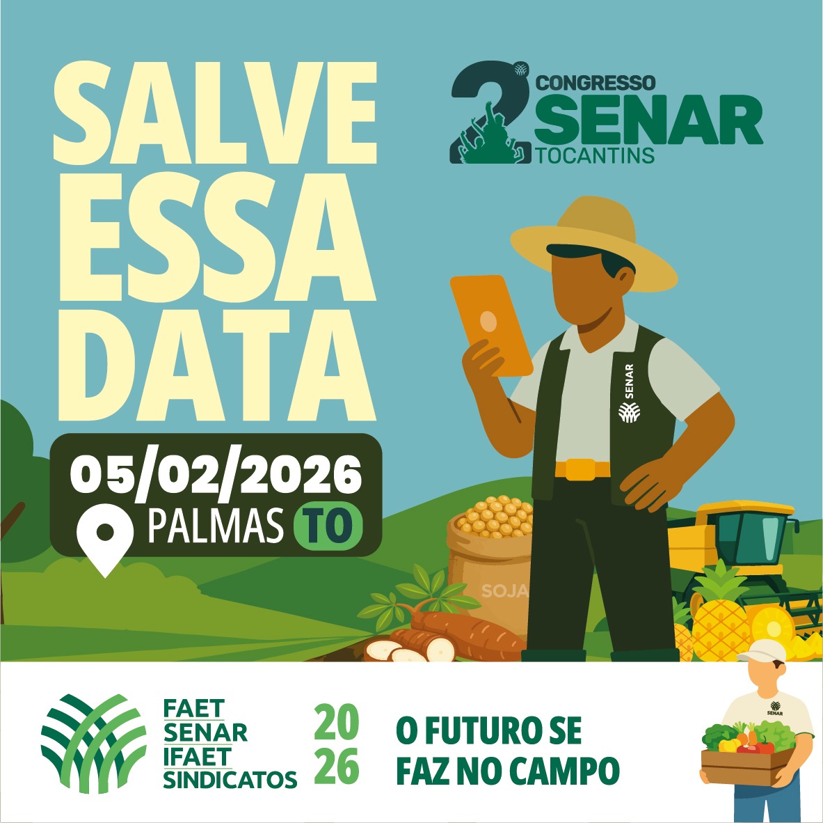 O Sistema FAET/Senar vai realizar nesta quinta-quinta (05), um encontro institucional histórico que terá dois momentos importantes: a realização do 2º Congresso Senar e a Cerimônia de Posse da nova diretoria da Federação da Agricultura e Pecuária do Estado do Tocantins (FAET), para o quadriênio 2026-2029.