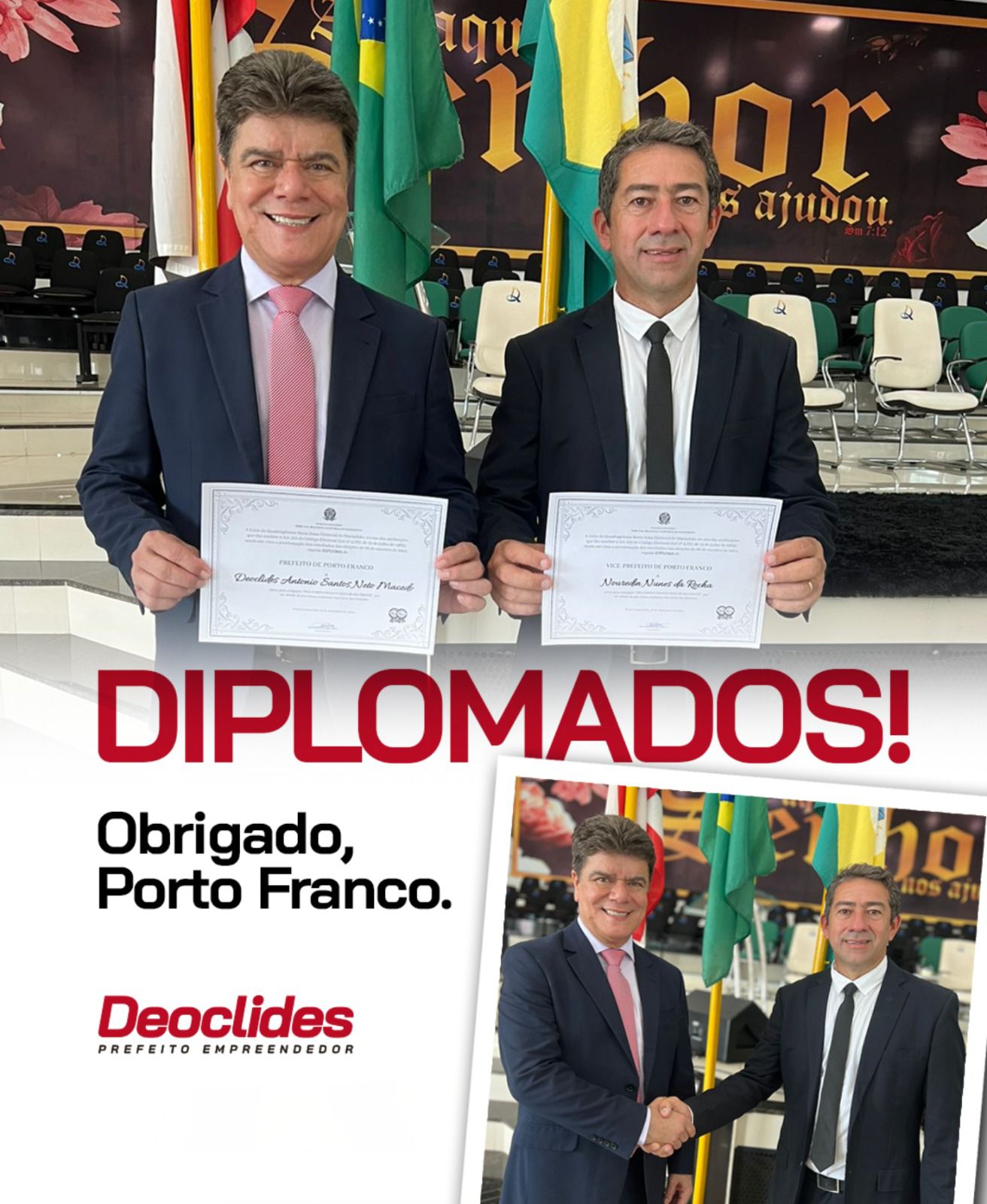 Em seu discurso, Deoclides Macedo destacou o significado da diplomação e renovou seu compromisso com o desenvolvimento do município. “Recebo hoje, com profunda gratidão e responsabilidade, o diploma que me confia, pela quinta vez, a missão de conduzir os destinos da nossa querida Porto Franco. Este momento representa não apenas uma vitória pessoal, mas a renovação de um pacto com o nosso povo, de continuar trabalhando com dedicação, diálogo e transparência para transformar sonhos em realidade. Agradeço a Deus, à minha família, ao meu vice Nouredin Rocha e, principalmente, aos 10.545 portofranquinos que acreditaram em nosso projeto. Vamos seguir firmes, com união e coragem, rumo a novos avanços e conquistas para a nossa cidade.”