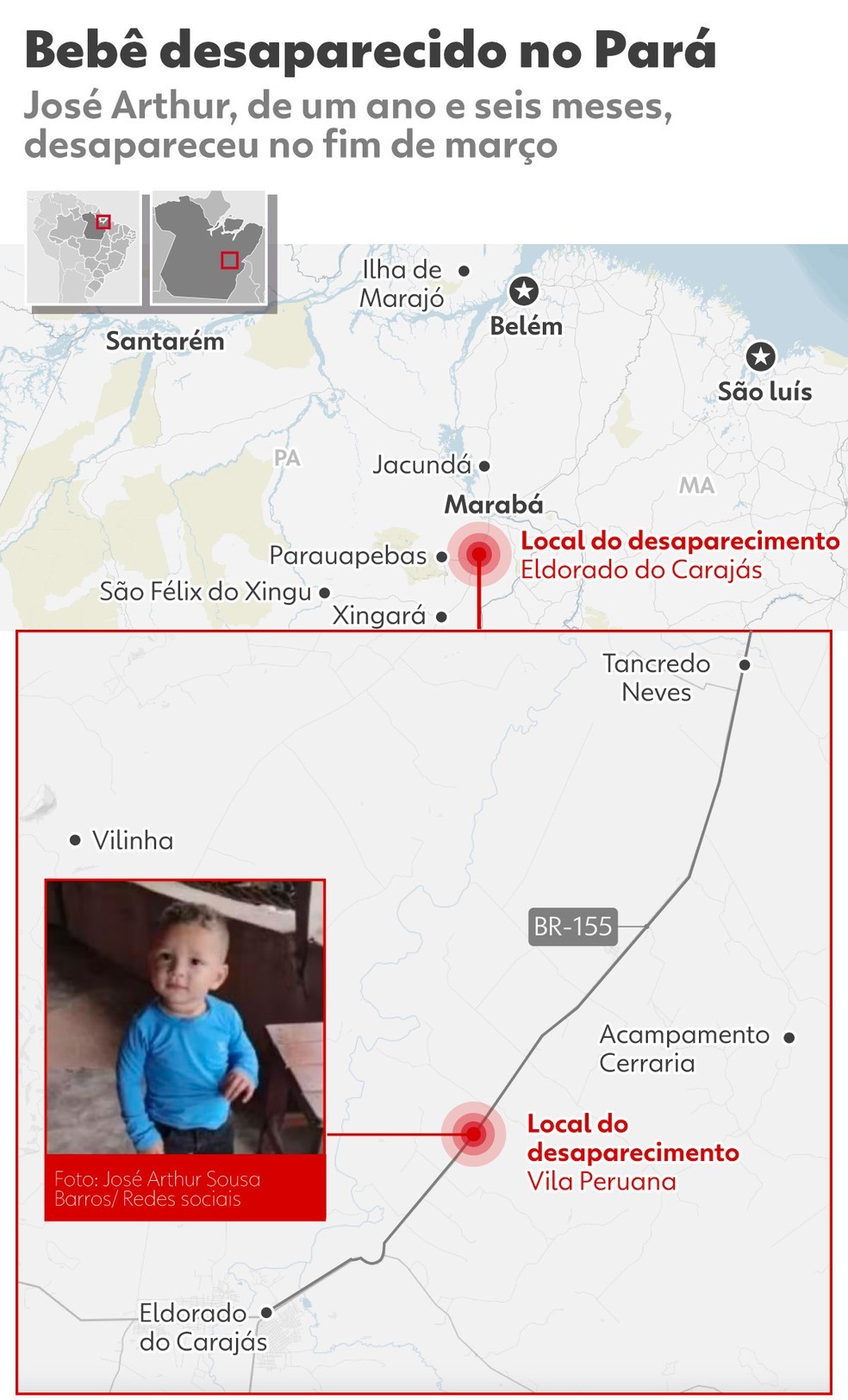 As investigações sobre o desaparecimento do bebê José Arthur recebem reforços a partir desta quarta-feira (8). Uma equipe da Delegacia de Pessoas Desaparecidas, de Belém-PA, viajou 652 quilômetros até Eldorado do Carajás, no sudeste do estado, para auxiliar nas buscas.