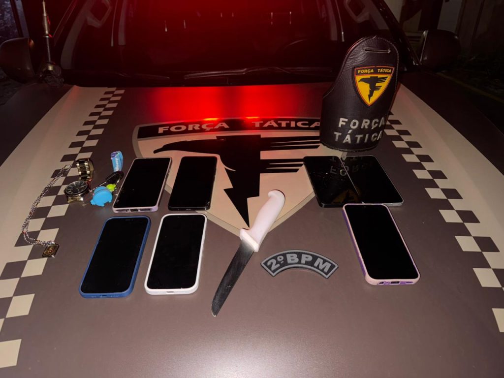 Na abordagem, os militares encontraram com os suspeitos sete aparelhos celulares, além de uma arma branca utilizada na prática do roubo. Diante do flagrante, os dois homens receberam voz de prisão.