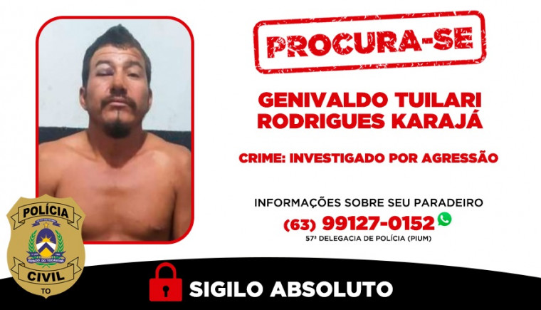 A Polícia Civil do Tocantins, por meio da 57ª Delegacia de Polícia de Pium, está à procura de Genivaldo Tuilari Rodrigues Nogueira Karajá, 40 anos, investigado por agressões e abusos contra uma mulher e sua filha na comunidade indígena Aldeia Ìtaro Awa, na região do município de Pium.