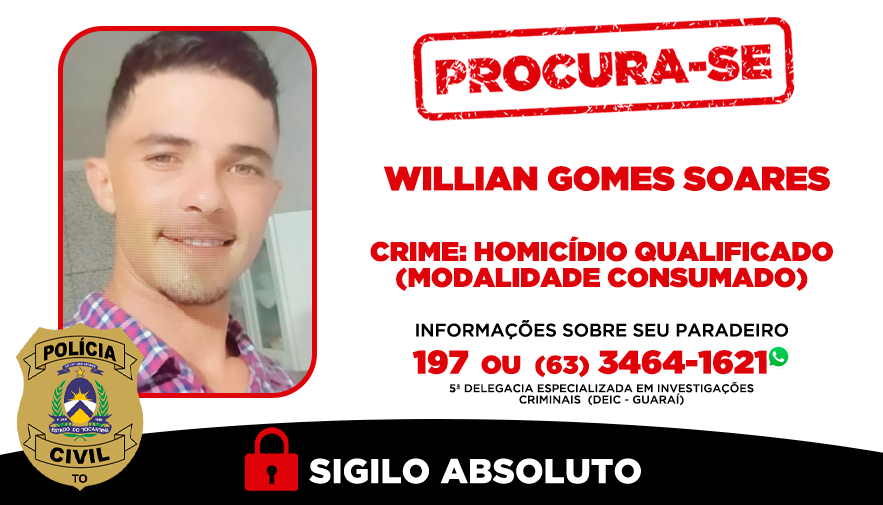 A Polícia Civil do Tocantins está à procura de Willian Gomes Soares, de 29 anos, conhecido como “Tora Galo”, investigado pelo homicídio qualificado de Douglas Junio Rodrigues da Silva, de 26 anos, apelidado de “Douglas 2000”, ocorrido no último dia 15 de fevereiro na zona rural de Tabocão. Ambos seriam de Guaraí e estavam em um evento de som automotivo na cidade vizinha quando o crime aconteceu.