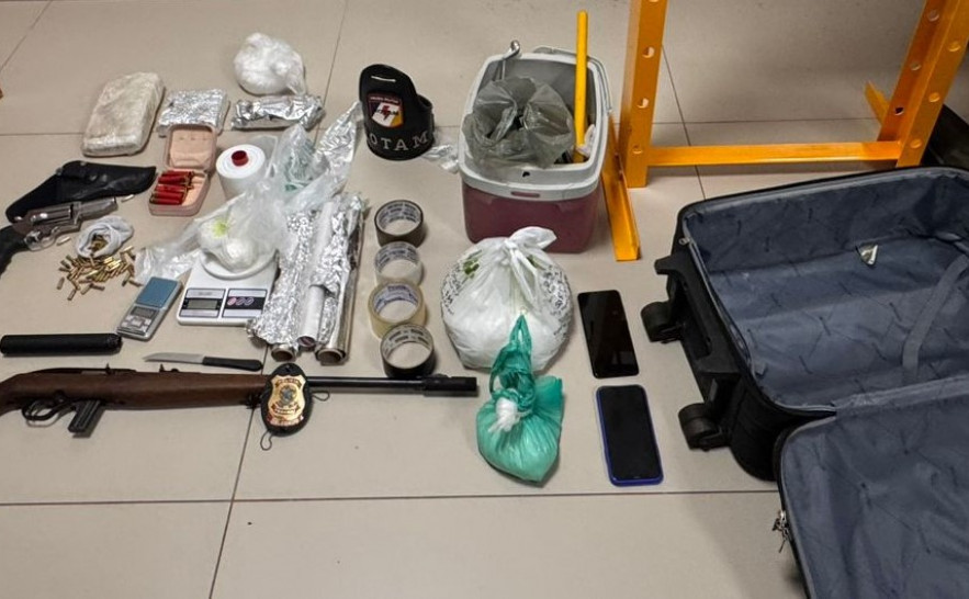 Durante as buscas no imóvel, os militares encontraram um revólver calibre .36 e um rifle calibre .22 escondidos sob uma cama. Também foi localizada uma mala contendo cerca de 4,558 kg de substância análoga à cocaína. No local, os policiais apreenderam ainda uma prensa hidráulica — utilizada para compactação e refino da droga —, duas balanças de precisão, 146 munições de diversos calibres e materiais para embalo e armazenamento dos entorpecentes.